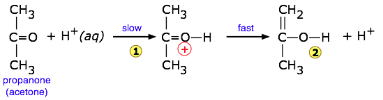 Many reactions are catalyzed by the presence of an acid or a base; in many cases, both acids and bases will catalyze the same reaction. As one might expect, the mechanism involves the addition or removal of a proton, changing the reactant into a more kinetically labile form. A simple example is the addition of iodine to propanone