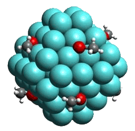 ← Model of a catalyst consisting of clusters of 8-10 platinum atoms (blue) deposited on an aluminum oxide surface. This catalyst efficiently removes hydrogen atoms from propane, converting it into the industrially-important propylene. [source]