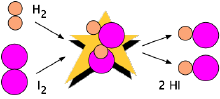 The mechanism of this reaction is different again. Although the first two reactions reach equilibrium in minutes to an hour or so at temperatures of 300 to 600 K, a mixture of hydrogen and chlorine will not react at all in the dark, but if you shine a light on the mixture, it goes off with a bang as the instantaneous reaction releases heat and expands the gas explosively. |