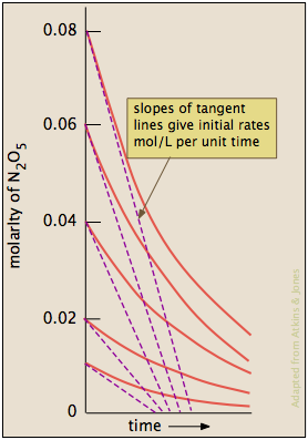 | Using the same dinitrogen pentoxide decomposition as in the previous example, we conduct a series of runs using five different initial concentrations of N2O5. Note that we use only the tangents at the beginning of each plot — that is, at times t=0. |